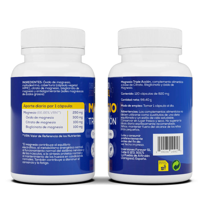 Pregunta 1: ¿Cuáles son los beneficios de usar este producto? Respuesta 1: Este producto ofrece una fórmula de triple acción que ayuda a combatir el cansancio y la fatiga, a la vez que se centra en la salud de las articulaciones, los huesos y los músculos. Está diseñado para favorecer la síntesis de cartílago y colágeno, contribuyendo al bienestar físico general. Pregunta 2: ¿En qué se diferencia este suplemento de magnesio de otros? Respuesta 2: Este suplemento ofrece tres formas complementarias de magnesio (citrato, bisglicinato y óxido) en una sola cápsula, lo que permite una mayor absorción y eficacia en el organismo en comparación con los suplementos de magnesio en una sola forma. Pregunta 3: ¿Hay alguna advertencia o problema de seguridad que deba tener en cuenta? Respuesta 3: Sí, es importante seguir la dosis diaria recomendada y no utilizar este suplemento como sustituto de una dieta equilibrada. Conservar en un lugar fresco y seco, y mantener fuera del alcance de los niños.
